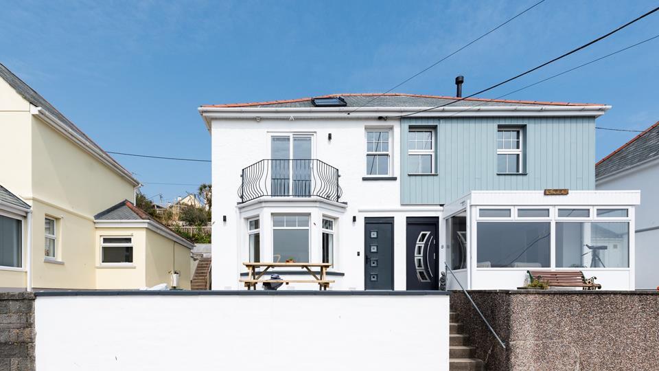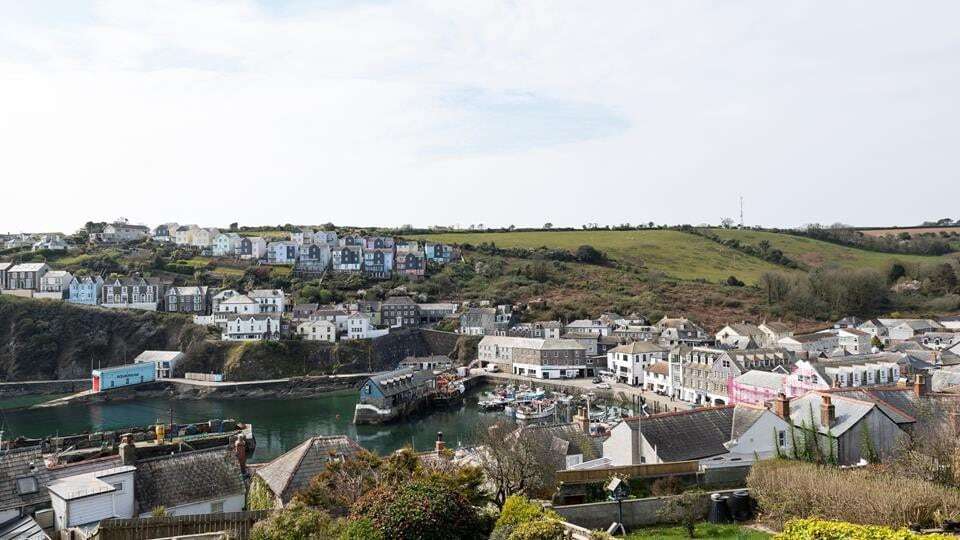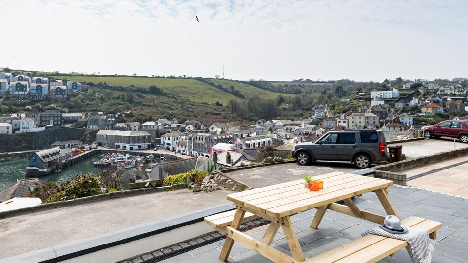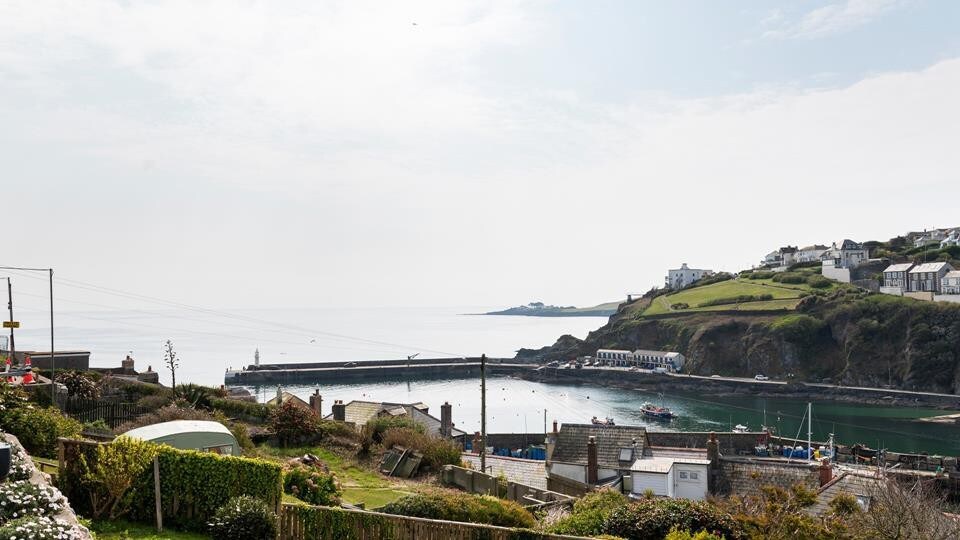 Bedroom 1 - Double bed, wardrobe, drawers and dressing table area. TV. Juliet balcony looking over Mevagissey.