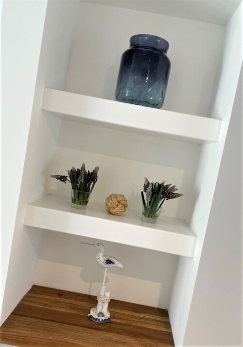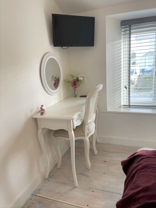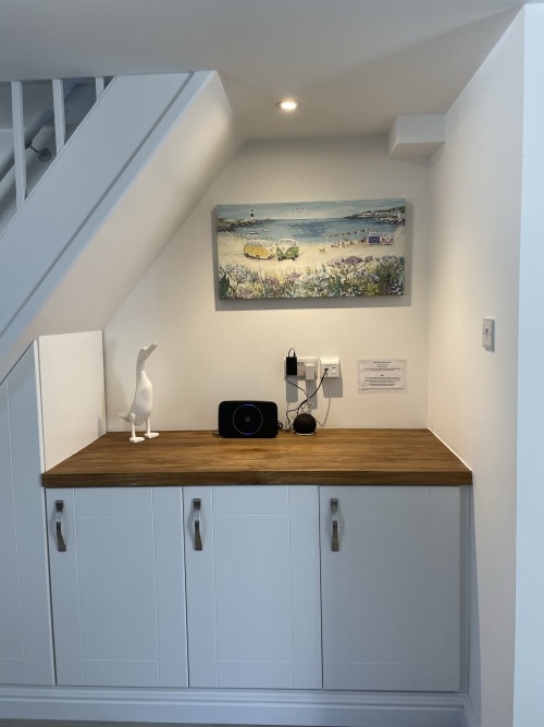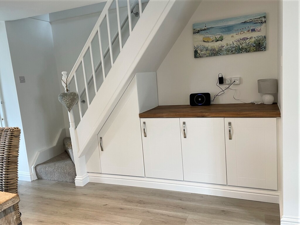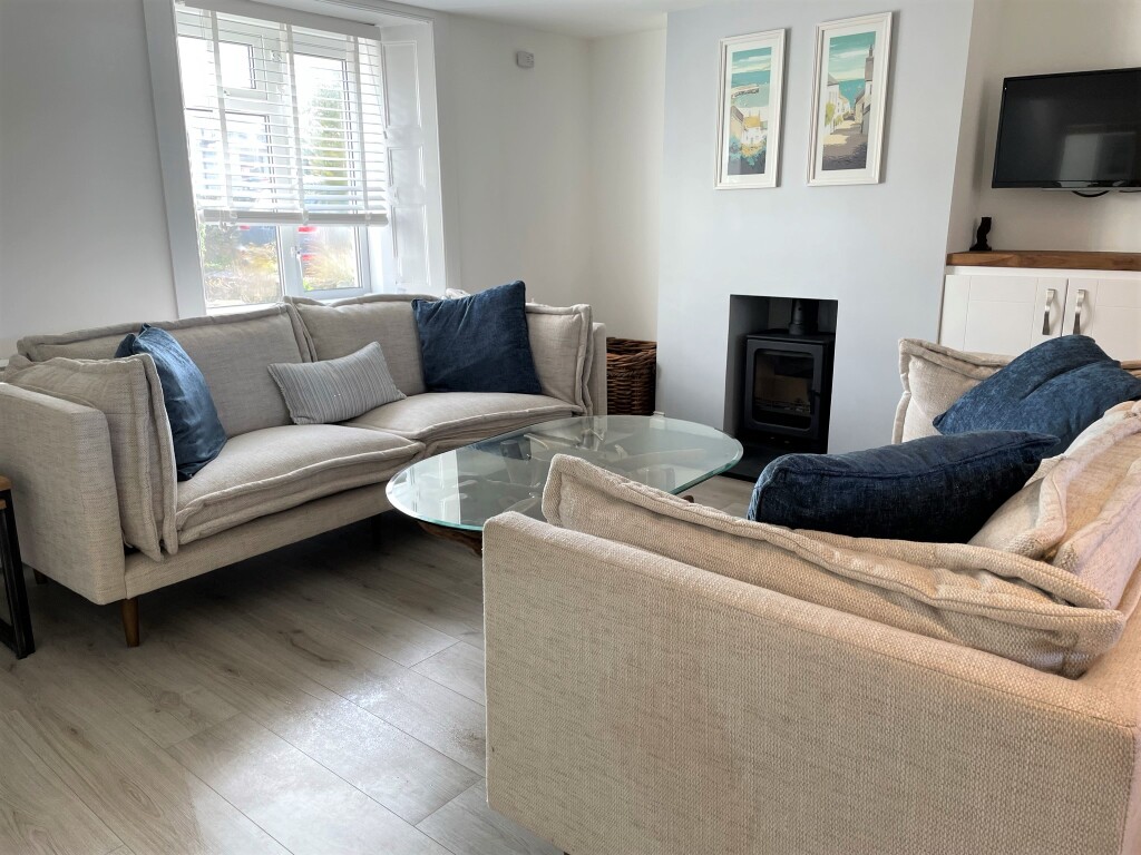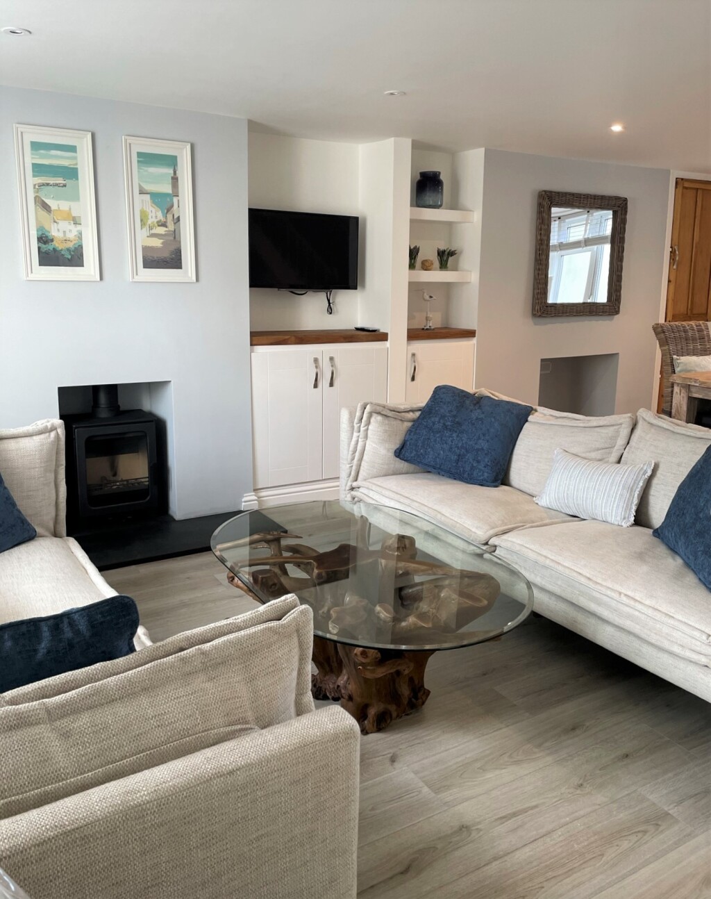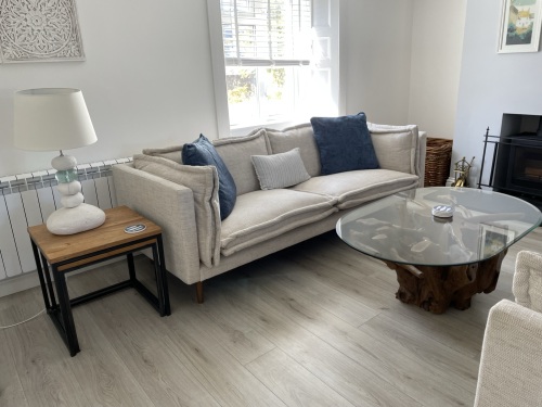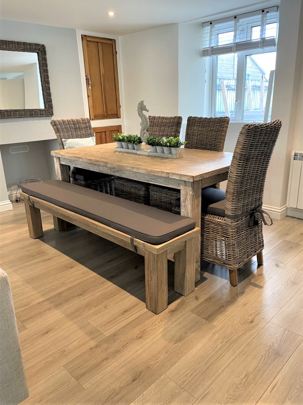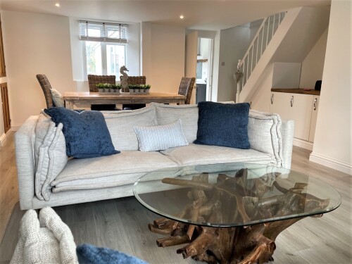 Open plan living / dining room: This is a very spacious room that encompasses the entire ground floor of the original cottage, with dual aspect window seats at the front and back of the house. It is beautifully furnished with comfortable sofas to seat six people and a large coffee table, great for board games and jigsaw puzzles. There is a log burner 32" smart TV. The large reclaimed Teak dining table is the perfect for leisurely dining, with views to the garden.
