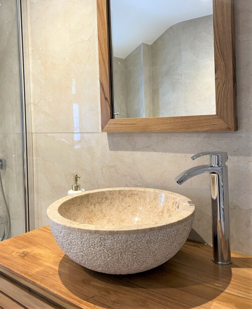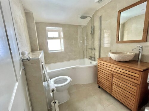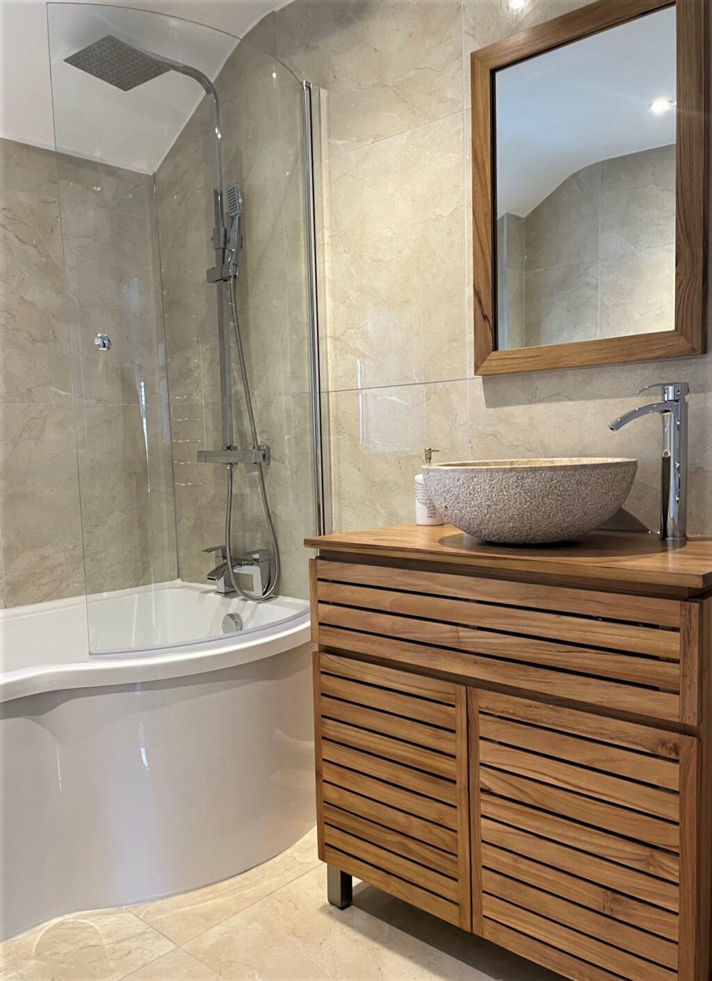 Bathroom: This is a luxurious space with a fitted bath, overhead rainfall shower, toilet and statement marble sink with a generous Teak vanity unit for ample storage.